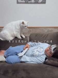 息子さんの異変に気づき、そっと寄り添う猫ちゃん。その姿からは、あたたかな絆が感じられました。