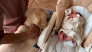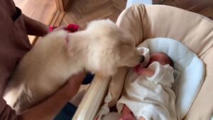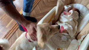息子さんとむうくんが初めて対面したのは、息子さんが生後5日目のこと。ベッドに乗せての慎重な対面でしたが、むうくんは大興奮な様子で息子さんの匂いを嗅ぎたがったり、ぺろぺろとなめたがったりしていたそうです。