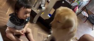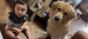 話題となったシンクロ動画は、息子さんが1歳3ヶ月のころに撮影されたもの。息子さんが赤ちゃん用のおやつを食べていると、むうくんもやってきて、@muu_goldenさんが「むう!」と声をかけると、むうくんと息子さんが同時にアイコンタクトをしたそうです。