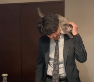 てぃびちゃんは、帰宅した旦那さんに体をすり寄せ、抱っこを求めて肩に手を伸ばします。
