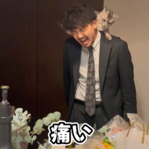 肩の上に乗ったてぃびちゃんは、旦那さんの顔や首にスリスリしています。しかし、あまりにも嬉しかったのか、旦那さんをカプっと噛んでしまいました。