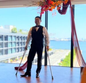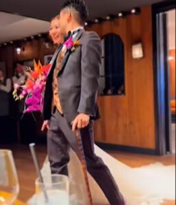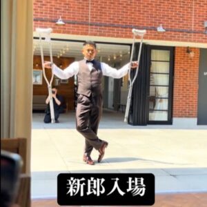 登場した新郎の手には松葉づえがありました。松葉づえを両手に持ってポーズをとると、笑い声や「本当に?」という声が上がります。