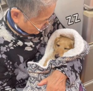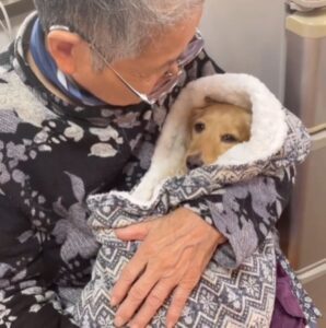 おくるみに包まれているのは、ダックスフンドのあむくん。おばあちゃんは、まるで人間の赤ちゃんのようにあむくんを抱っこしています。