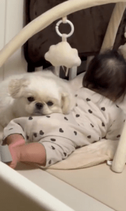 ぷっちょくんはこの日だけでなく、普段から娘さんと仲良く過ごしているそうです。ベビーサークルの中に入ってきては、我が物顔で寝ているのだとか。