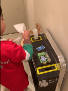 切符を自動で排出する仕組みは難しかったため、お出かけ時にティッシュをすっとだせるようにして、楽しさを演出しました。下部のスペースは息子さんの靴箱にして、登園準備がスムーズになるように工夫したそうです。