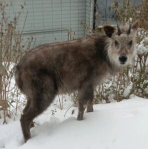 窓の外をじっと見つめているニコちゃん。その先にいたのは、カモシカでした!