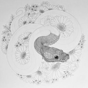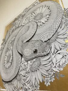 また、こだわった部分は構図です。花とヘビはどちらかが目立ちすぎても成り立たないため、バランスを考えたそう。
