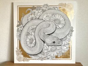 Sakiさんは、2025年の4月と5月に個展が決まったため、メインビジュアルになる大きな絵を描こうと思いつきます。爬虫類をメインに描いており、今年の干支にちなんでヘビを選びました。