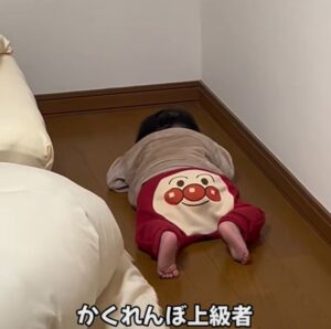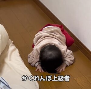 すると、娘さんは床にふせ始めます。ママさんによると、かくれんぼをする時いつもその場で隠れるといいます。
