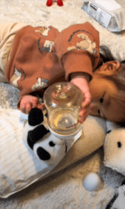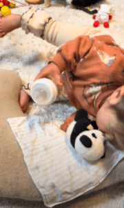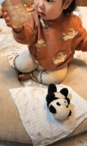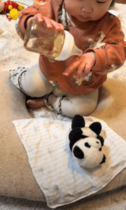 動画に映っていたのは、パンダのぬいぐるみをクッションに寝かせ、ミルクを飲ませようとする娘さんの姿。なんとミルクをあげる前の『哺乳瓶をよく振る』『手の甲に少し垂らして温度をチェックする』ところまでしっかり再現していたのです。