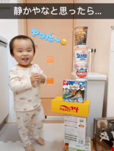 この日、ママさんは走り回っていた息子さんを横目に洗濯物を干していました。急に静かになったので様子を見に行くと、カップ麺を積み上げている息子さんと目が合ったそうです。
