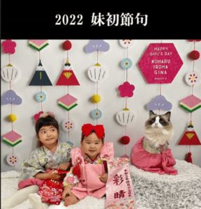 最初の一枚は、長女さんが生後9ヶ月の頃。初節句のお祝いでおめかしした長女さんの頭には、大きな赤いリボンがついています。1年後の2020年には長女さんの隣に猫ちゃんが加わり、お揃いのはかま姿で撮影。