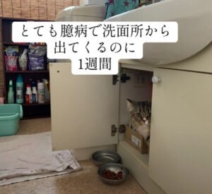 しかし、カルビくんはご飯は食べてくれたものの、来てから1週間は洗面所から一切出てきません。お風呂用の小さな椅子や、洗面台の下の収納の奥に身を隠していたそうです。