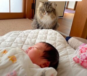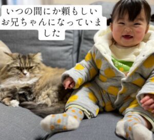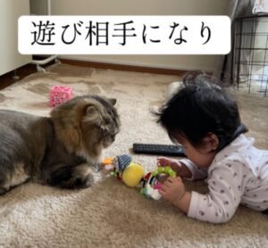 それからは、娘さんが起きているときは常に近くにいるように。娘さんが泣いたときには、その声よりも大きめの声でニャーと鳴くそうです。まるで「大丈夫?」と言っているかのように。