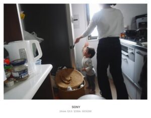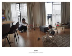 撮影当日、ダイニングテーブルとは別に、小さな丸テーブルには、朝からおままごとをしていたのが伝わるようなおもちゃが置かれていて、微笑ましく感じたそうです。食べ物のおもちゃが無造作に置いてあり、本当にありのままの2人の日常に立ち会わせてもらったような感覚になった@uta_utai_123さん。おふたりを包むやさしい空気まで残せるよう意識し、愛おしい瞬間をその場の空間と自然光とのバランスをみながらシャッターを押しました。