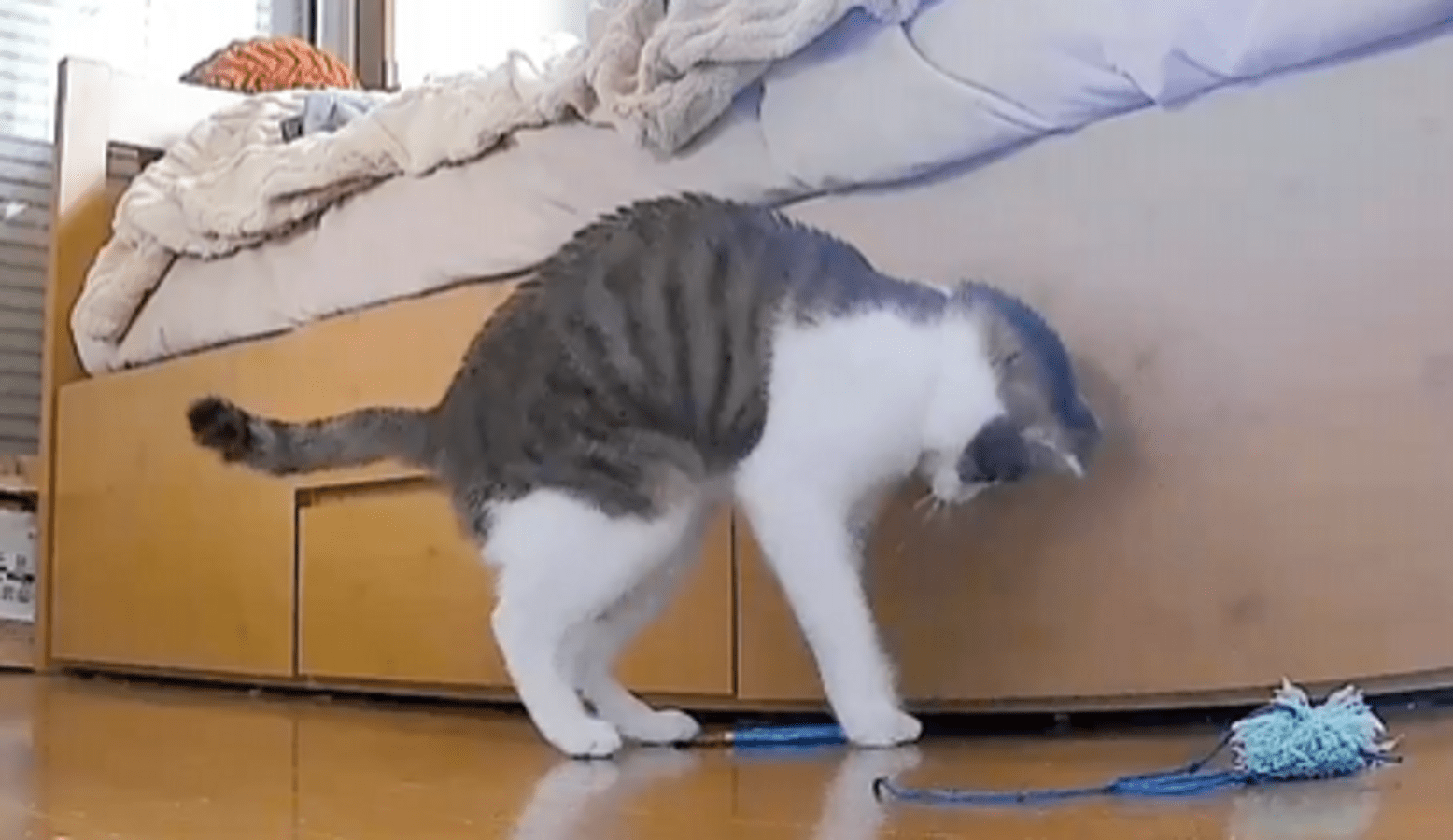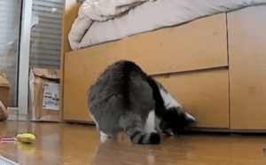 しかし次の瞬間、持ち上げようとしてうっかり手を滑らせたのか、おやつはまさかのベッドの下へ。