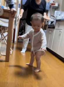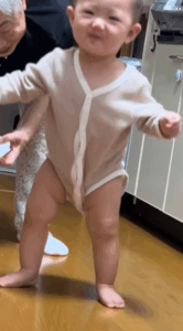 ほんのひと口食べた後の出来事。ひ孫さんは、急に補助なしで立ち上がり、数歩歩き始めたのです。
