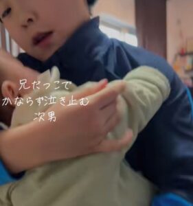9歳のお兄ちゃんは、生後2ヶ月の弟くんを上手に抱っこしていました。弟くんは、お兄ちゃんの抱っこで必ず泣き止むといいます。