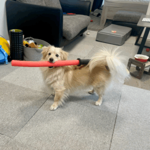剣をくわえ写真に写っているのは、ポメラニアンとカニンヘンダックスの雑種であるとろろくん。1歳の男の子です。