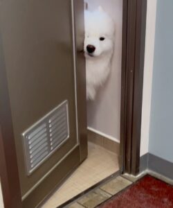 トリマーさんが部屋の扉を開けたところ、ダッツくんは勢いよく出てきました。しかし、あまりにも勢いがよすぎて、扉に挟まってしまったようです。