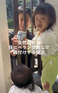 ベランダにやって来たのは、49歳のおじいちゃん。柵の間からお孫さんたちに飲み物を渡していました。お孫さんたちも嬉しそうにおじいちゃんに寄って行き、おじいちゃんも笑顔になります。