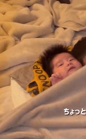 お布団で横になる赤ちゃん しかし、隣をよく見ると…「泣き止んだ」「偉い」「さすが兄弟」「愛おしい」