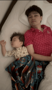 息子さんのお昼寝タイムということで、パパさんが寝かしつけていたそうですが、どうやら一緒に寝てしまったようです。