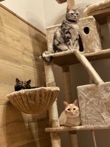 @yurimichi_chanさんのおうちには、さんちゃんのほかにも、アメリカンショートヘアのまるちゃん、サビ猫スコティッシュのぺけちゃんがいます。