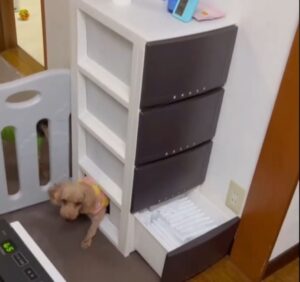 引き出しの裏側に回ったポポちゃんは、一瞬姿を消したかと思えば、引き出しが動き始めました。