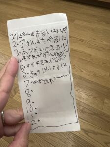 紙は折れ、マーカーはにじみ、文字も判読困難。書いた本人さえ“解読不能”になる結末に、家族で大笑いです。