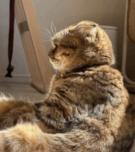 ある日、ふと目を覚ましリビングを見てみると、壁際で座っていた猫のまつたけちゃん。