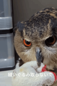 大切なものをそっと隠して守るジュニアちゃんの姿には、フクロウならではの賢さと、家族への信頼が感じられます。