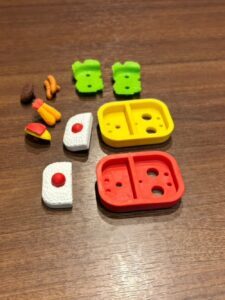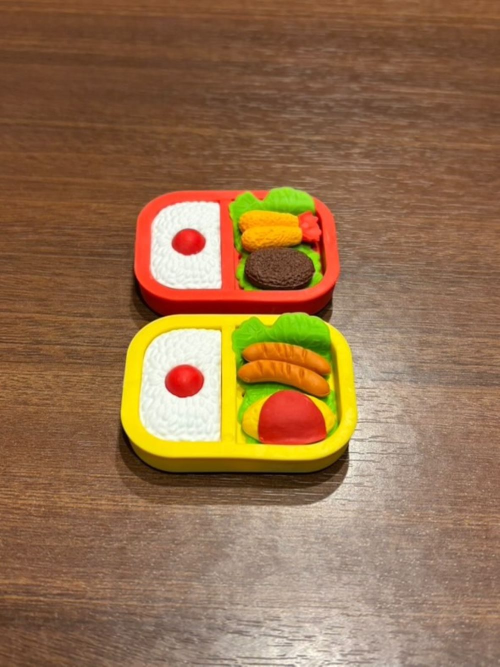 ある日、娘さんは消しゴムでできたお弁当のおもちゃの詰め方に悩んでいました。消しゴムのおもちゃは2つあり、バラバラにして自由におかずを組み合わせられます。