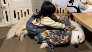 シュシュちゃんの大きくてふわふわの体で寝転んでいるのは、赤ちゃんの頃の娘さん。とても気持ちよさそうに寝転がっています。