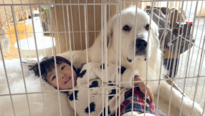 元々は、先住犬のトイプードル用のケージですが、普段からお気に入りの場所として入っているシュシュちゃん。このときも、シュシュちゃんがケージの中にいたところ、娘さんも一緒に入ってしまったようです。