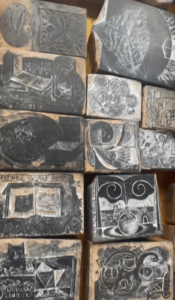 引き出しの中には、椿やレモンなど硬質な木を使用した木口木版(こぐちもくばん)という木版画が約100点、表裏両面に彫られた作品もあるといいます。もとは立てて保管していましたが、埃が溜まるのを防ぐため、引き出しに移して整理したのだとか。