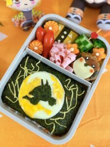 ご飯で立体的に表現されたキャラクターのまわりには、星や花の形にくりぬかれたチーズやにんじんが彩りを添え、かわいらしくポップなお弁当に仕上がりました。下準備を前日にしたうえで、お弁当の構成から調理、盛り付けまでには、1時間半ほどだそうです。