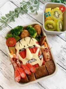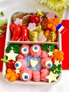 そして、完成したお弁当には、赤い小さな丸の目に囲まれた、青い顔が見事に再現されています。