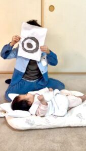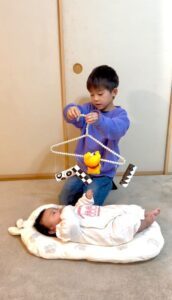 お兄ちゃんが作ったベビージムは、妹さんも興味をもったようで、キョロキョロしたりぬいぐるみを触ったりと楽しんでいます。