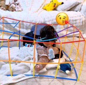 たまたまストローのおもちゃで工作をしていたお兄ちゃん。家を作ろうとしていた途中で、妹さんがすっぽり入ることに気がつき、妹さんも遊べるベビージムへと変化していきました。重いぬいぐるみを付けたところ壊れてしまったので、なるべく軽いぬいぐるみを多くつけるように工夫していたお兄ちゃん。