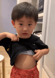 原因は、ズボンを深く履きすぎていたこと。シャツをめくってもおへそが見えないので「なくなった」と思い込んだようです。その様子を、お兄ちゃんも心配そうに見守っていました。