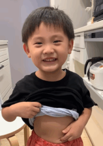 「ん~~~」と呪文を唱えてお腹を「ポン!」とすると… ちゃんとおへそが現れて、弟くんに笑顔が戻りました。
