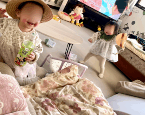 娘さんたちは、部屋に入った瞬間からとても楽しそうで、まるで遊び場に来たかのように大喜び。2人で部屋を歩き回り、椅子に座ってみたりテーブルを叩いてみたり…。おもちゃも片っ端から遊び、大きなテレビで大好きなキッズチャンネルも楽しみました。