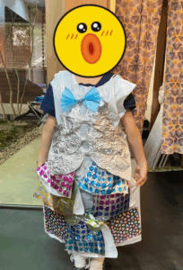 「そうだ!服を作ろう!」と、ゴミ袋など身近な素材を使って作られた可愛らしいドレス。