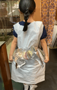 着ているうちに「セロハンテープがちょっとチクチクする」「ビニールは脱ぎにくい」「ちょっと暑い」など改良点も発見。