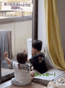 2人はテラス戸のそばに座っていました。妹ちゃんが、ガラスに手を当てて「あーーー!」と声を出すと、お兄ちゃんも同じように「やーーー!」。