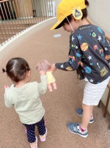 最近は、お兄ちゃんの言葉やしぐさをよく真似る妹さん。たとえば、お兄ちゃんが「おやつちょうだい」と言うと、妹さんもやってきて、同じように「おやつちょうだい」と繰り返します。
