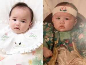 あるとき、パパさんが自身の100日祝いの写真を見せてくれました。その顔は、娘さんの100日祝いの写真と瓜二つ。写真の色味や衣装こそ違いますが、まるで同一人物のようにそっくりでした。