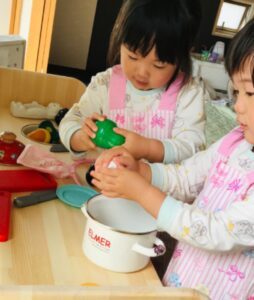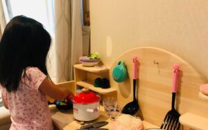 双子ちゃんのお孫さんが2歳の頃、おじいちゃんはままごと用のキッチンを作ってくれました。