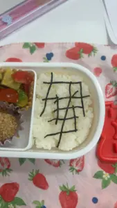 LINEには写真も付いていたため、見てみたところ、ご飯の上には細い海苔がのっていました。実は、ママさんとしては、白いご飯がそのままでは寂しいと思い、何とか飾ろうとチェック柄にしていたそうです。